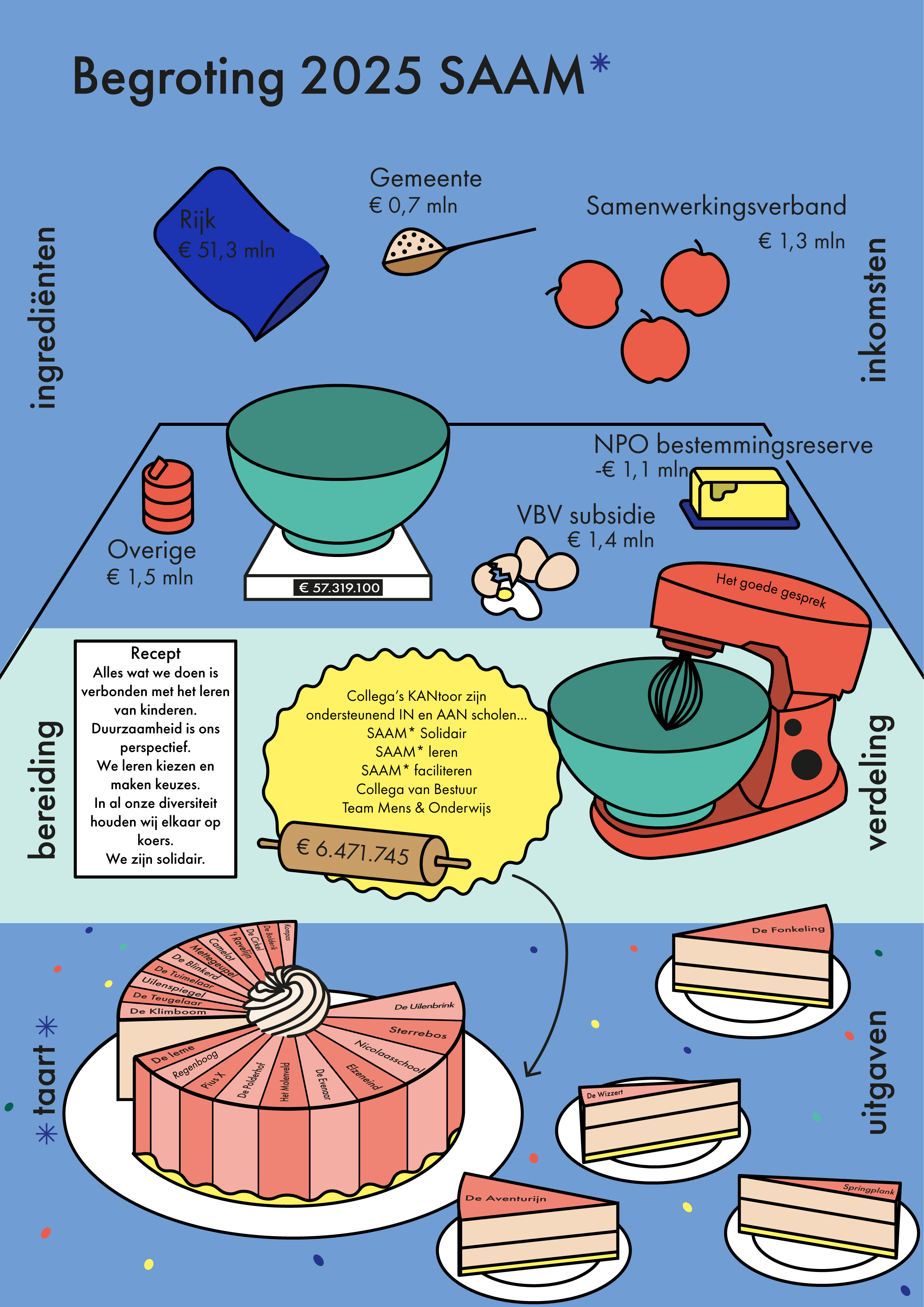 Bij SAAM* wordt alles ingezet voor leren en lesgeven. Middelen gaan zoveel mogelijk naar onderwijs. In onze manier van organiseren maken we een afweging van efficiëntie en effectiviteit. We gaan voor duurzame ontwikkeling. We leggen open en transparant verantwoording af over de dingen die we doen. We zijn verbonden met en verantwoordelijk voor onze gezamenlijke opdracht, die breder is dan het eigen vak, de eigen groep, de eigen school. Wij zijn solidair. Samen zijn we verantwoordelijk voor kansen voor alle kinderen. De wereld is dynamisch, we richten onze blik naar binnen en naar buiten en maken dan keuzes.En hoe dat uitpakt, zie je in deze visuele begroting. Waarin we laten zien met welke ingrediënten we werken en wat voor ons belangrijk is bij het maken van de begroting (taart). En natuurlijk zijn we dan trots op het resultaat.